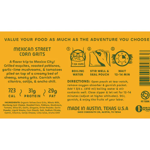 Ingredients: Organic Texas-grown yellow corn grits, organic whole milk, Monterey jack cheese, corn, poblano, mushroom, grape tomato, olive oil, garlic, oregano, onion powder, garlic powder, liquid pecan smoke, corn starch, sodium citrate, salt, cilantro, cotija, lime juice, ancho chili