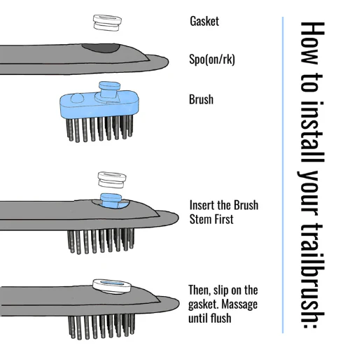 - To install the brush: slide the stem in the hole, making sure the bristles are facing down and that the stabilizer dot it closer to the spoon end. Flip the gasket over and slot it around the stem, making sure that the wide end of the gasket is on top and that the whole gasket makes its way under the stem end.